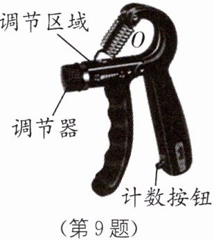 9 新情境 可调式握力器 如图所示为可调式握力器,锻炼时抓住左手柄,用力使其碰触右手柄上的计数按钮,完成一个握力动作,这个过程中左手柄拉动弹簧围绕连接点 O 旋转.握力器的力度通过旋转调节器移动弹簧下端的位置来改变,若将力度调小,则应将弹簧下端向 ______(填“左”或“右”)移.如果小明用平均大小为 260 N 的力抓握力器,使其在力的方向上移动6 cm,则做功为 ______J.