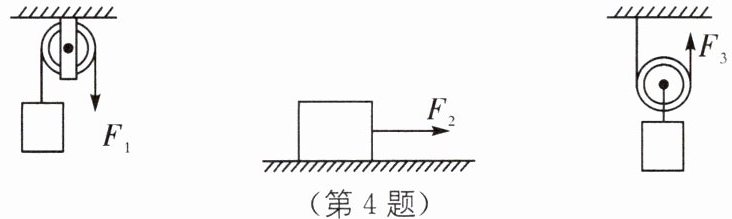 4 如图所示的三种场景中,拉力$F_{1}$、$F_{2}$、$F_{3}$大小相等,在拉力的作用下物体移动的距离相等.若拉力所做的功分别记为$W_{1}$、$W_{2}$、$W_{3}$,下列关于它们大小关系的判断中正确的是( ).