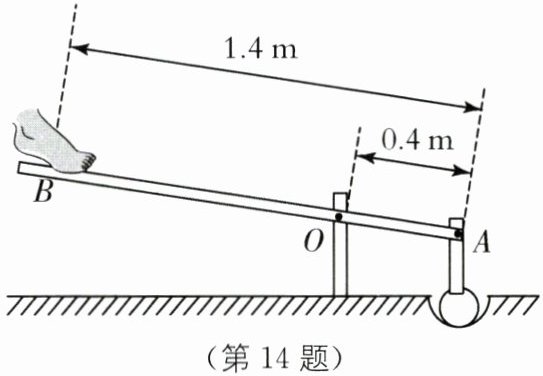 (2)根据杠杆平衡条件$F_{2}=\frac{G_{石球}l_{1}}{l_{2}}=\frac{50\ N×0.4\ m}{1.4\ m-0.4\ m}=20\ N$;脚沿与杆垂直的方向用力时,动力臂等于OB长,而沿竖直向下方向用力时动力臂小于OB的长,故$F_{2}\gt F_{1}$.