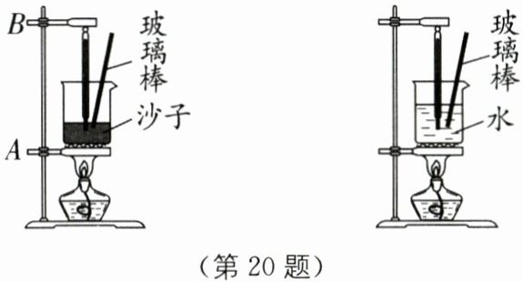 20.(14分)中考新考法 结论开放性实验 夏天,小明去海边游玩时发现:中午沙子较热,海水较凉,而傍晚沙子较凉,海水较热. 对此现象小明提出了猜想:可能是沙子吸热或放热后,温度变化比水大. 为了比较水和沙子容热本领的大小,小明做了如图所示的实验:在2个相同的烧杯中分别装有质量、初温都相同的水和沙子,用两个相同的酒精灯对其加热.