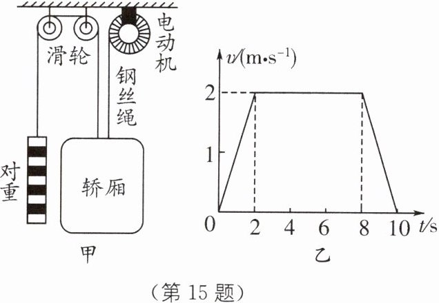 15 电梯是高层住宅必备的交通工具.如图甲所示是某种升降电梯工作原理图,它由轿厢、对重、电动机、钢丝绳、滑轮等部件连接组成.电动机和对重通过钢丝绳分别给轿厢施加拉力,连接轿厢的两根钢丝绳非常靠近,轿厢与对重的运动方向始终相反.对重的质量为 400 kg,空轿厢的质量是 500 kg,额定载重量是 1000 kg,某次电梯满载上升时的 v-t 图像如图乙所示.不计钢丝绳重力和一切摩擦,g 取 10 N/kg.问: