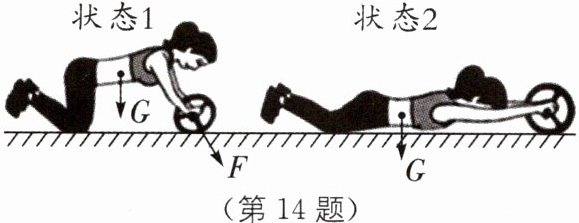 14 新情境 用健腹轮健身 健腹轮是一种健身器材,使用时可将膝盖跪在垫上,双手紧握健腹手柄,向前推动健腹轮至身体水平于地面,然后回收归位,反复操作,如图所示.问:
