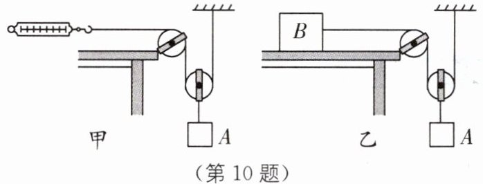 10 (2024·南京鼓楼区一模改编)如图甲所示,物体 A、定滑轮和动滑轮的重分别为 30 N、10 N 和10 N,若用 25 N 的力 F 拉动细绳,使物体 A向上做匀速直线运动,已知在 2 s 内,物体 A上升高度为 10 cm,则克服物体 A 的重力做的功为______J,拉力 F 做的功为______J,拉力 F 的功率是______W.如图乙所示,将测力计换成某重物 B 后,发现物体 A 可以匀速向下运动.若增大 A 的重力,则重物 B 和桌面间的滑动摩擦力大小将______.