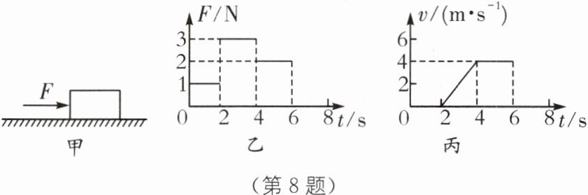 8 如图甲所示,放在水平地面上的物体,受到方向不变的水平推力 F 的作用,F 的大小与时间t 的关系和物体运动速度 v 与时间 t 的关系如图乙、丙所示.则( ).