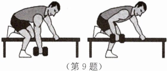 9 跨学科 单臂哑铃划船 “单臂哑铃划船”运动能充分训练背阔肌.训练时,按照如图所示姿势,提升、放下哑铃为1次动作.已知哑铃质量为15 kg,训练者 60 s 完成一组训练,每组 12 次动作,每次提升哑铃的竖直高度是 30 cm.则训练者在1次提升哑铃过程中做功是______J,完成一组训练过程中提升哑铃做功的功率是______W.(g 取 10 N/kg)