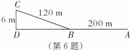 6 如图所示为某路段的示意图,水平路面 AB= 200 m、斜坡 BC= 120 m、坡高 CD= 6 m,有一辆装载货物后总质量 m= 5 t 的货车,当它以恒定功率$ P_1= 1.5×10^4 W $在 AB 段行驶时,用时$ t_1= 20 s,$以恒定功率$ P_2 $在 BC 段匀速直线行驶时,用时$ t_2= 16 s,$货车在 AB 段和 BC 段行驶时受到的阻力大小相同,g 取10 N/kg,求: