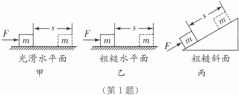 1 如图所示,物体在相同力 F 的作用下,分别在光滑水平面、粗糙水平面和粗糙斜面上沿着力的方向移动了相同的距离 s,力 F 做的功分别为$W_1、$$W_2、$$W_3,$则$ W_1______W_2______W_3.($填“>”“=”或“<”)