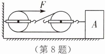8 如图所示,小聪用滑轮组拉动水平地面上重为500 N的物体A,使它匀速前进2 m,地面对它的摩擦力为150 N,小聪施加的拉力F= 100 N(忽略绳重和滑轮重),则滑轮组做的有用功为 J,滑轮组的机械效率为 .