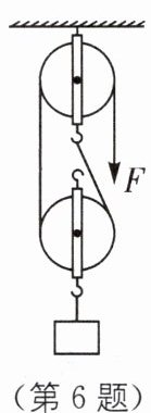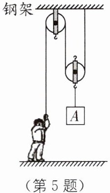 5 如图所示,滑轮组悬挂在水平钢架上,某工人站在水平地面上,竖直向下拉动绳子自由端,5 s内使物体A匀速上升1 m,提升过程中拉力F的功率为160 W.已知物体A重为720 N,该工人重为600 N.关于该过程,不计绳重和滑轮的摩擦,下列说法正确的是( ).