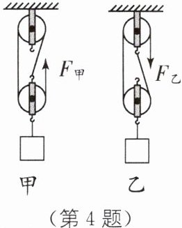 4 用如图所示甲、乙两种方式将同一重物匀速提升相同高度.图中所有滑轮等重且不计绳重和摩擦.在重物上升过程中,甲的有用功 乙的有用功,甲的额外功 乙的额外功,甲的机械效率 乙的机械效率.(填"大于""小于"或"等于")