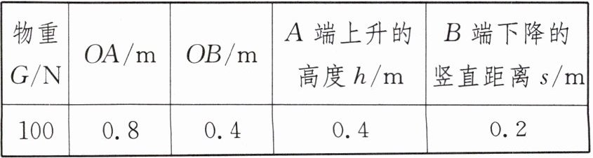 |物重G/N|OA/m|OB/m|A端上升的高度h/m|B端下降的竖直距离s/m|