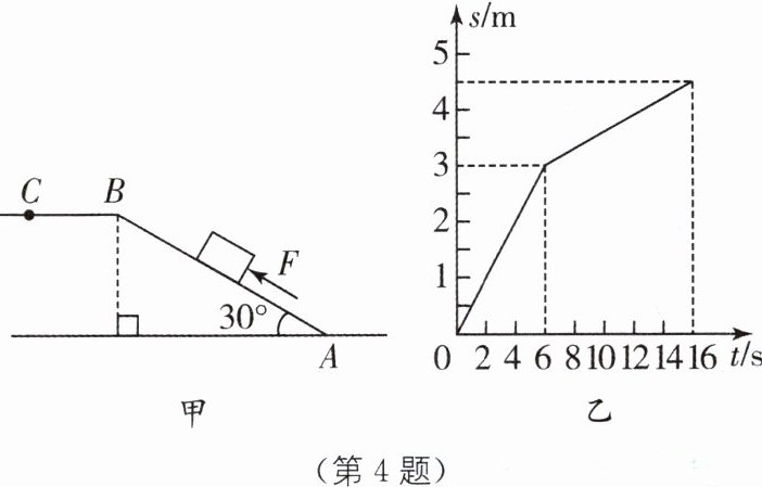 4 工人用沿斜面向上,大小为 500 N 的推力 F,将质量为 80 kg 的货物从 A 点匀速推至 B 点;再用 100 N 的水平推力$ F_1$使其沿水平台面匀速运动到 C 点;图乙为物体从 A 点经 B 点到达C 点的 s-t 图像.(g 取 10 N/kg)求: