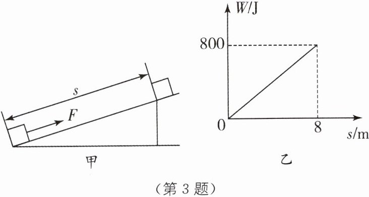 3 一个木箱重为 400 N,工人用沿斜面向上的拉力 F 将木箱匀速拉到高处,如图甲所示.整个过程中拉力 F 做的功 W 与木箱沿斜面运动距离 s 的关系如图乙所示,整个过程的额外功是160 J,则拉力 F= ______N,斜面的机械效率η= ______,木箱受到斜面的摩擦力 f= ______N.