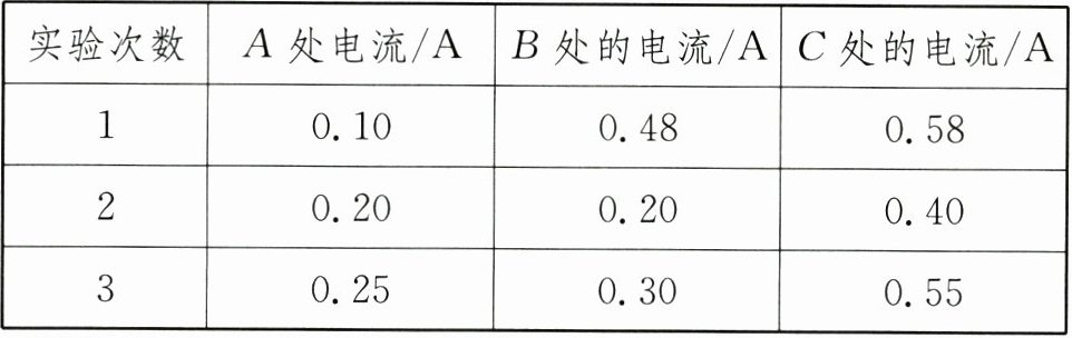 |实验次数|A处电流/A|B处的电流/A|C处的电流/A|