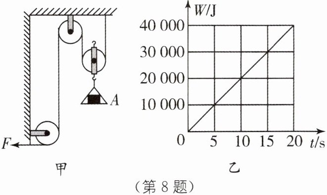 8 人在绳子的自由端用拉力 F 通过如图甲所示的滑轮组,将放在罐笼 A 中的重为 1440 N 的建筑材料匀速提升 10 m,用时 10 s,绳子自由端移动的速度为______m/s,所做的有用功为______J;拉力 F 所做的功随时间变化的图像如图乙所示,忽略摩擦及钢丝绳、动滑轮的重,则滑轮组的机械效率是______.