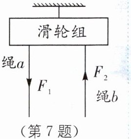 7 (2024·无锡惠山区一模)某兴趣小组用滑轮组进行了一场别开生面的“一桶水提升一个人”活动.如图所示,水桶匀速直线下降8 m,使人匀速升高0.4 m,水桶对绳a 的拉力为$ F_1= 30 N,$绳b 对人的拉力为$ F_2= 480 N. $此过程中,下列说法正确的是( ).