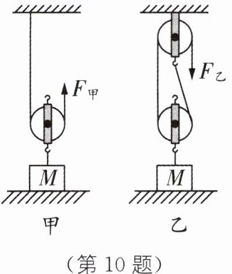10 如图所示,小明分别使用甲、乙图中两种不同的机械将同一物体M匀速提升相同高度.测得两次拉力$F_{甲}$、$F_{乙}$和物体M所受的重力$G_{M}$如表所示.当使用乙机械时,测得绳子自由端移动的距离是物体M上升高度的2倍.