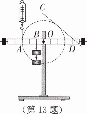 (2)在杠杆后面安装一个以O为圆心的圆盘,把弹簧测力计从A点移到D点,施加拉力$F_{1}'$使杠杆在水平位置保持平衡,此时拉力$F_{1}'$沿图中的CD线的方向(CD是圆O的切线).