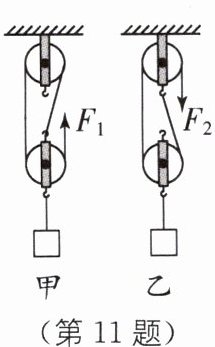 11 用相同的滑轮和绳子分别组成如图所示的甲、乙两个滑轮组,绳子受的拉力分别为$F_{1}$、$F_{2}$,保持甲、乙两绳自由端的速度相同,把相同的物体匀速提升相同的高度.若不计绳重及轴处摩擦,下列说法正确的是( ).