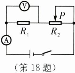 18. (6分)如图所示电路,电阻$R_1$的阻值为30Ω。闭合开关,当滑片P在滑动变阻器$R_2$最右端时,电压表的示数为4.5V;当滑片P移到滑动变阻器中点时,电压表的示数为6V。求: