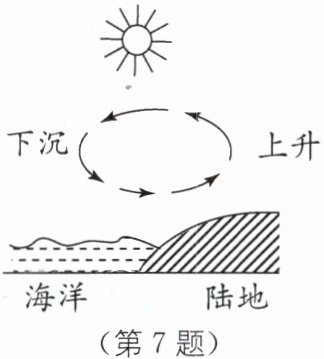 7 如图所示是海陆风形成的示意图.因为陆地上沙石的比热容比水的比热容______(填“大”或“小”);白天,阳光下陆地升温较______(填“快”或“慢”),热空气上升,空气从海面流向陆地,夜晚空气流向相反,由此形成海陆风.