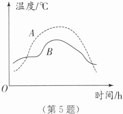 5 如图所示是某沿海城市和内陆城市在同一天的气温变化曲线,沿海城市气温变化对应的曲线是______(填“A”或“B”),这是由于水的比热容______(填“大于”或“小于”)沙石的比热容,相同质量的水和沙石吸收相同热量后沙石的温度变化较______(填“大”或“小”).