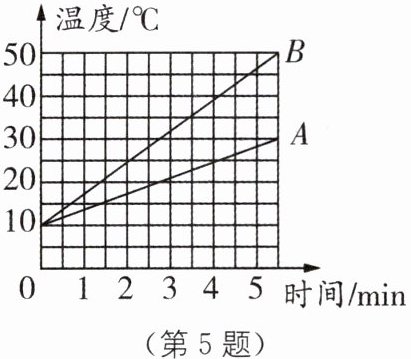 5 用两个相同的电热器给质量同为 2 kg 的物质 A 和 B 加热,它们的温度随时间的变化关系如图所示,则物质 ______(填“A”或“B”)的比热容大;物质 A 和物质 B 的比热容之比 $c_{A}:c_{B} = $______.