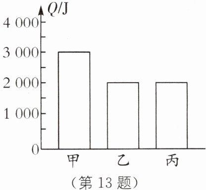 13 甲、乙两物体质量都为 1 kg,丙物体质量为 2 kg,三个物体温度都升高 1 ℃,吸收热量如图所示.以下说法正确的是( ).