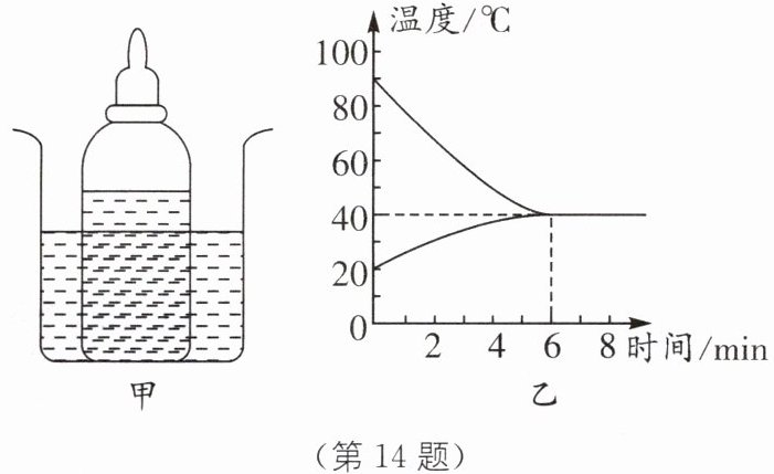 14 将盛有凉牛奶的瓶子放在热水中(如图甲所示),通过 ______的方式改变牛奶的内能.图乙是 250 g 牛奶与热水的温度随时间变化的图像,则牛奶在加热过程中吸收的热量为 ______J.[$c_{奶}= 2.5× 10^{3}\ \text{J/(kg·℃)}$]