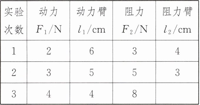 |实验次数|动力$F_1/N$|动力臂$l_1/cm$|阻力$F_2/N$|阻力臂$l_2/cm$|