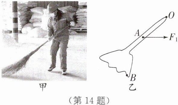14 如图所示为工人师傅用笤帚扫地的情景.O是支点,右手作用在笤帚上A点的动力为$F_1,$请在图乙中画出动力$F_1$的力臂$l_1$和作用在B点的水平方向的阻力$F_2$的示意图.