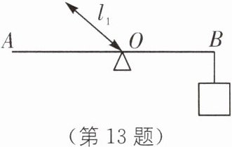 13 如图所示,杠杆AB处于平衡状态,请作出杠杆所受阻力$F_2$的示意图和动力臂$l_1$对应动力$F_1$的示意图.