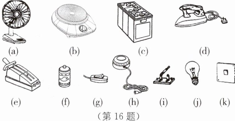 16 图中列出了一些日常生活与生产中用到的电源、用电器和开关,你能区分它们吗?请把它们按要求分类.(填序号)