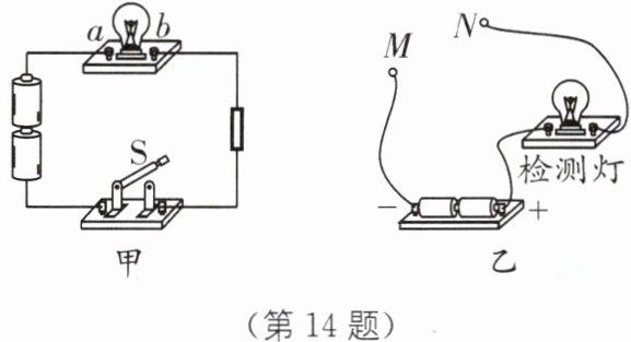 14 (2024·甘肃武威期末)物理课上,老师拿出一个电路板,如图甲所示,开关 S 闭合后,发现灯 L 不亮. 现已确定是灯 L 短路或 L 断路引起的,要求检测是哪一种故障,小羽做了如图乙所示的检测电路,将故障电路的开关 S 断开,分别把 M、N 接到 a、b 接线柱上,若检测灯亮,则故障是______;若检测灯不亮,则故障是______.
