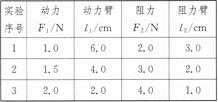 |实验序号|动力$F_1/N$|动力臂$l_1/cm$|阻力$F_2/N$|阻力臂$l_2/cm$|