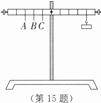 15 在“探究杠杆的平衡条件”实验中,为了便于测量力臂,先调节杠杆两端的平衡螺母,使杠杆在 位置平衡;为使杠杆保持平衡状态,应在 (填“A”“B”或“C”)处挂2个相同钩码.