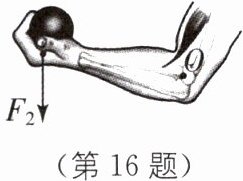 16 按要求作图:如图所示,人的手臂相当于一个杠杆,它的支点在O点,请在图中画出动力$F_1$及铅球对手的作用力$F_2$的力臂$l_2.$