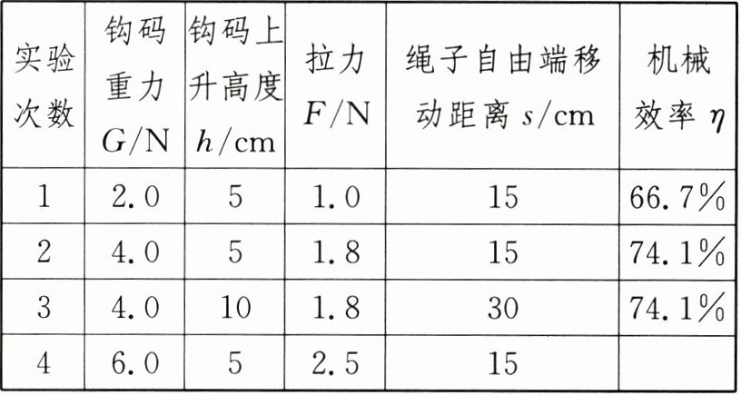 (2)第4次实验时所做的有用功为$W_{有用}=Gh = 6.0\ N× 0.05\ m = 0.3\ J$;$W_{总}=Fs = 2.5\ N× 0.15\ m = 0.375\ J$;滑轮组的机械效率为$\eta=\frac{W_{有用}}{W_{总}}× 100\%=\frac{0.3\ J}{0.375\ J}× 100\%=80\%$。