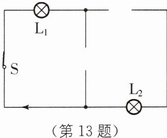 13 如图所示,根据电路中标出的电流方向,选择电源、电流表、电压表三个元件中的两个符号填入电路空缺处,使两只灯泡并联.