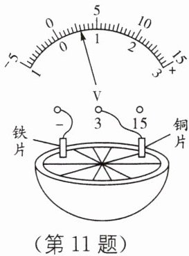 11 (2024·淮安中考)如图所示,取一个橙子,把铜片、铁片插入其中,制成一个水果电池.