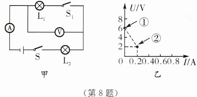 8 如图甲所示,若只闭合开关 S,电压表示数如图乙①位置所示,若同时闭合开关 S 和$ S_1,$电压表示数如图乙②位置所示,则灯泡$ L_2$两端的电压是______V,电源电压是______V.