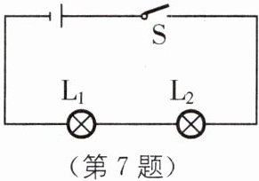 7 在“探究串联电路的电流特点”实验中,同学们把两个不同规格的小灯泡连接在如图所示的电路中,闭合开关后,发现两灯均发光,但$ L_1$较暗$,L_2$较亮.这是为什么呢?他们提出的猜想是由于$ L_2$靠近电源正极,所以流过$ L_2$的电流比流过$ L_1$的电流大.为了验证猜想是否正确,采取的实验方法是______.最后得出串联电路电流的特点是______.