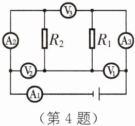 4 新情境 黑盒子 俄罗斯“库尔斯克”号核潜艇在巴伦支海遇难.救援人员在艇内发现了记录潜艇各种信息的“黑盒子”,其某一部件外壳上三个电压表的示数分别为$U_1、$$U_2、$$U_3,$三个电流表的示数分别为$I_1、$$I_2、$$I_3,$它的内部结构如图所示,以下对各数据的分析正确的是( ).