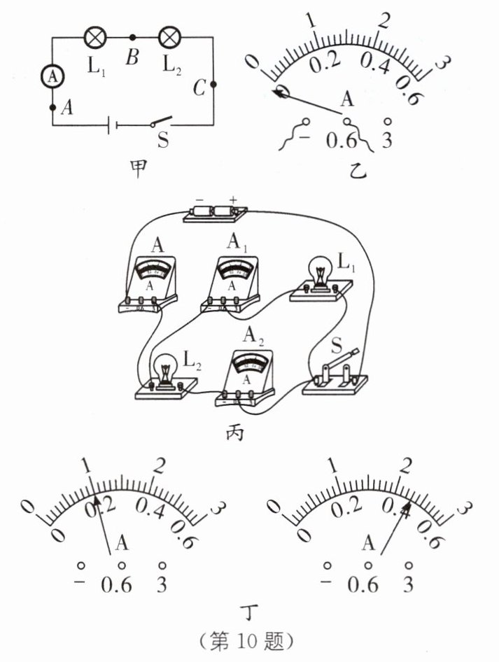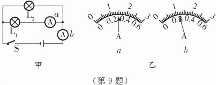 9 如图甲所示的电路,开关S闭合后,两电流表的指针偏转如图乙所示,则通过$L_1$的电流为 A,通过$L_2$的电流为 A;接下来小明将$L_2$换成$L_3,$电路其他都未改变,闭合开关后,发现两个电流表的指针偏转角度相同,则通过$L_3$的电流为 A.