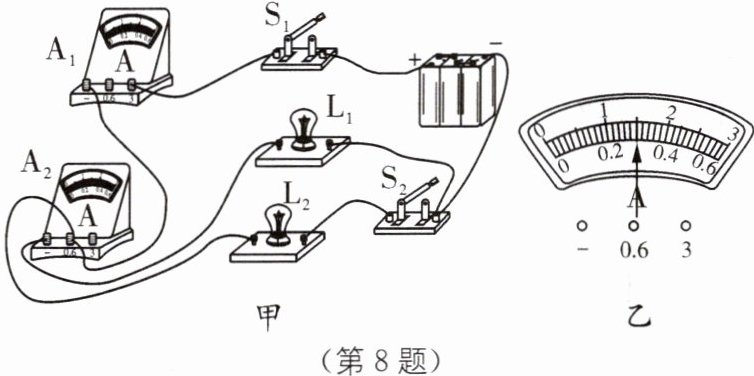 8 如图甲所示电路,闭合开关$S_1、$$S_2$时,灯泡$L_1$和$L_2$发光,电流表$A_1、$$A_2$的指针指在同一位置如图乙所示.下列说法中正确的是( ).