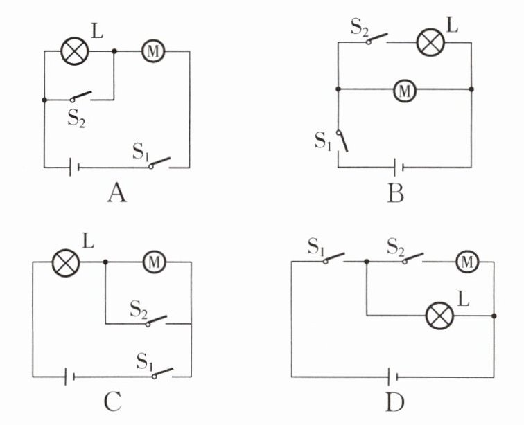 D [解析]由题意知,S₁闭合,灯L发光,照亮人脸进行识别,但不开锁,人脸识别成功后S₂闭合,电动机M工作,即两开关都闭合时电动机才能工作,这说明灯泡与电动机是并联的,开关S₁在干路中,S₂在电动机的支路中,故D正确.
