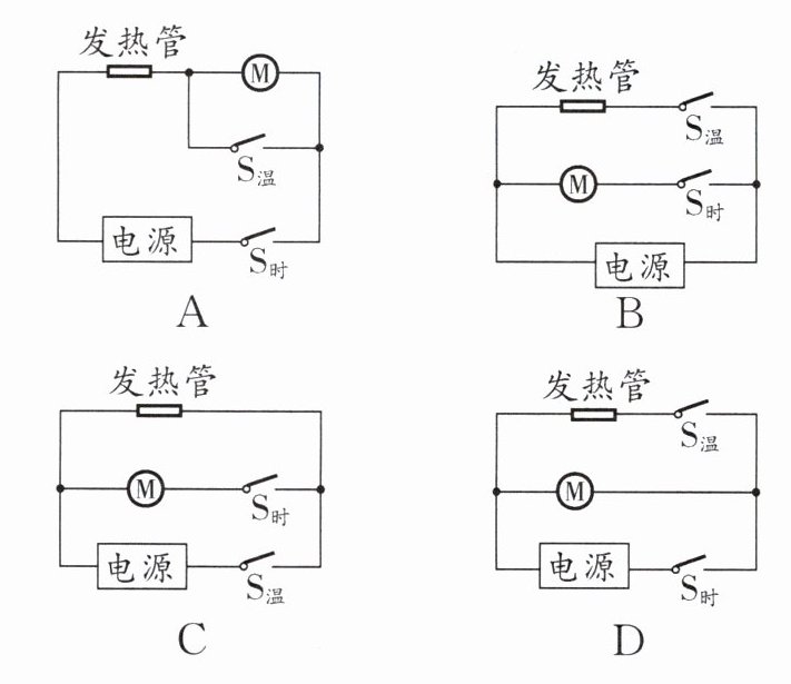 D [解析]由图A可知,发热管和电动机串联,同时闭合定时开关和温控开关,只发热不吹风,故A不符合题意.由图B可知,发热管和电动机并联,只闭合温控开关时,只有发热管工作,只发热不吹风,故B不符合题意.由图C可知,发热管和电动机并联,只闭合温控开关时,只有发热管工作,只发热不吹风,故C不符合题意.由图D可知,只闭合定时开关时,电动机工作产生冷风;再闭合温控开关时,电动机和发热管同时工作吹热风;只闭合温控开关时发热管不工作,不会出现只发热不吹风,故D正确.