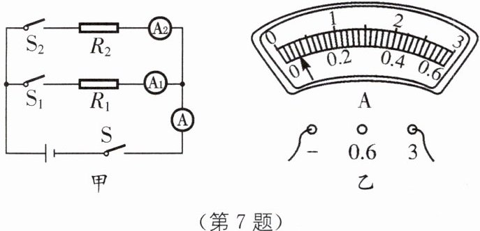 7 在研究并联电路电流特点时,按如图甲所示电路图连接好电路.闭合开关S和$S_1,$观察电表示数,再闭合开关$S_2,$示数保持不变的电流表是 (电源电压不变),同时小明观察到电流表A的示数如图乙所示,为了使测量更精确,断开开关后,接下来的操作是 .