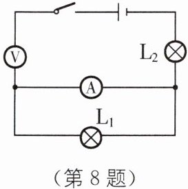 D [解析]由题图知,电压表串联在电路中,电流表并联在L₁两端,而电压表的内阻很大,电路中的电流几乎为0,电流表电阻很小,L₁被短路,故两个灯泡都不会发光,电流表指针几乎不动,此时电压表测电源电压,则电压表指针发生较大偏转,故D正确.关键提醒:电压表的内阻很大,在电路中当成断路看待,电流表内阻很小,在电路中当成导线看待.