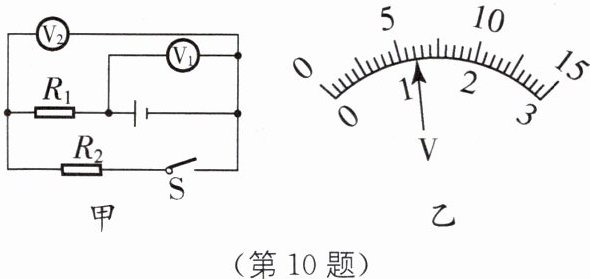 10 如图甲所示的电路中,闭合开关后,两个电压表指针均如图乙所示,则$R_1$两端电压为 V;开关断开时,电压表$V_2$示数为 V.